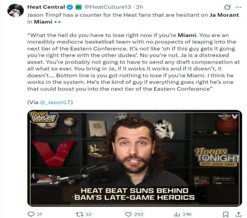 迈阿密的媒体专家贾森-廷普夫谈到了热火与莫兰特的交易流言,他这样说道:热火对莫兰特的加盟是持怀疑态度的!